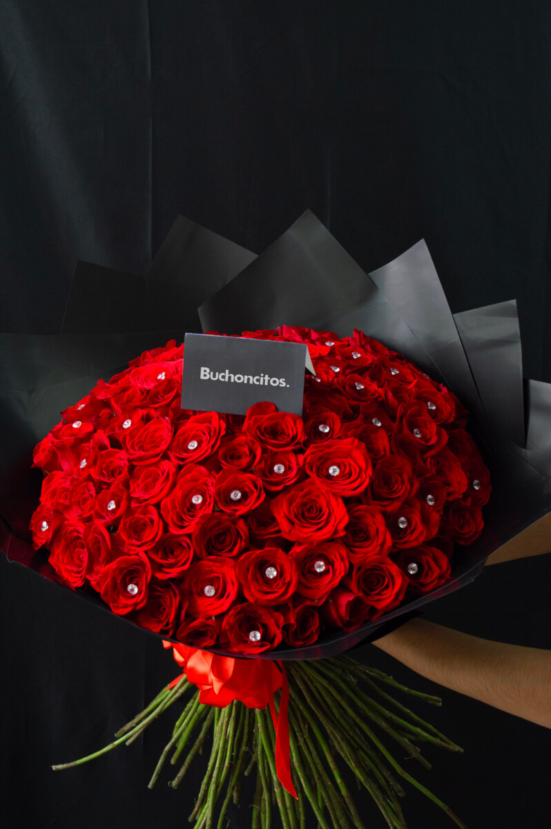 100 rosas premium adornadas con destellos de cristal que iluminan cada pétalo; un espectáculo brillante que El Patrón entrega para robar miradas y suspiros. -1RMB-1